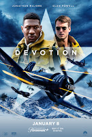 There are wonderful moments when Jonathan Majors (Jesse) and Glen Powell (wingman Tom) are shown bonding while training for their missions, and Christina Jackson as Jesse’s devoted wife does well with an underwritten part. But Devotion is content to be a straightforward biopic rather than a challenging one.
